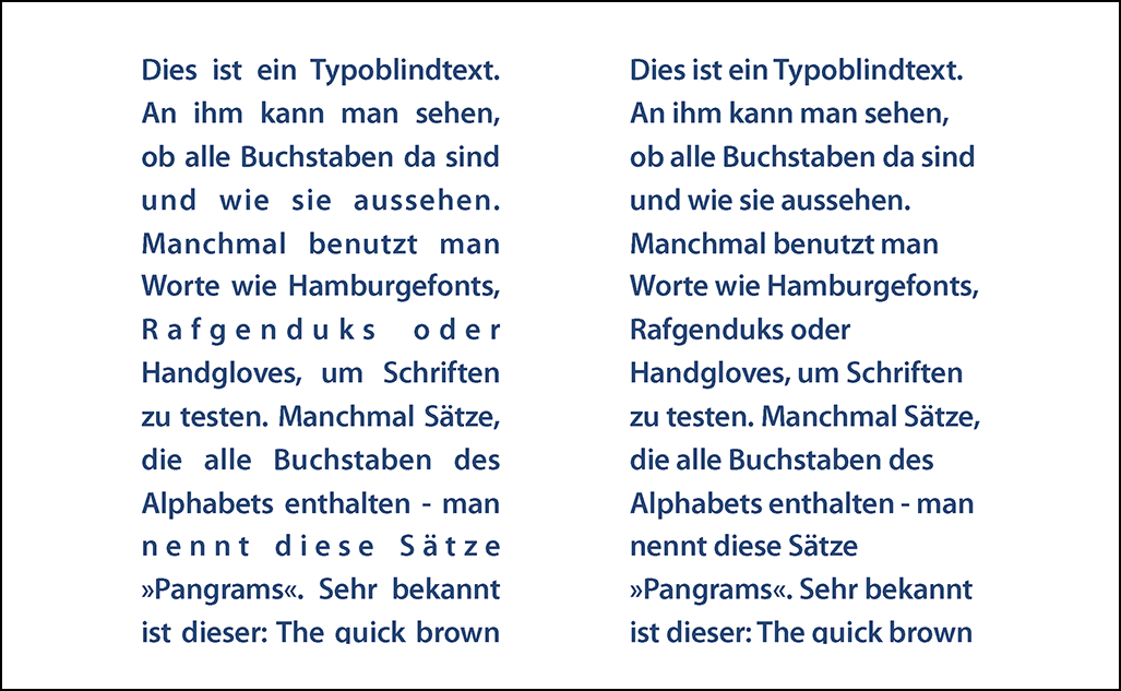 Der Abstand zwischen den Buchstaben, auch Laufweite genannt, sollte grundsätzlich nicht verändert werden. Er ist bei einer gut gestalteten Schrift ausgewogen und tritt dadurch in den Hintergrund. Bei sehr großer Schrift (z. B. Überschriften, Laufweite verringern), sehr kleiner Schrift (Laufweite erhöhen) sowie bei hellem Text auf dunklem Hintergrund sollten Sie die Laufweite verändern. Denn hier verbessert die Laufweite das Schriftbild und die Lesbarkeit.