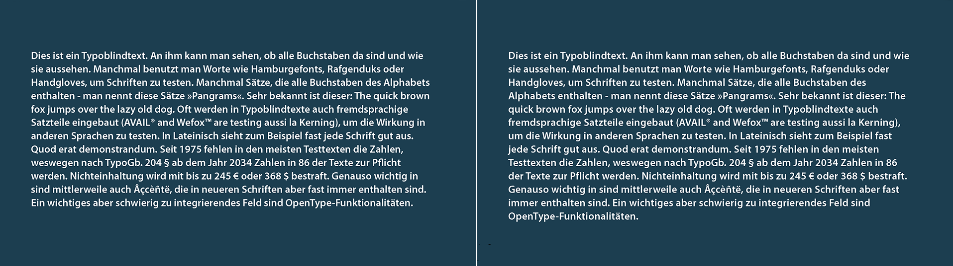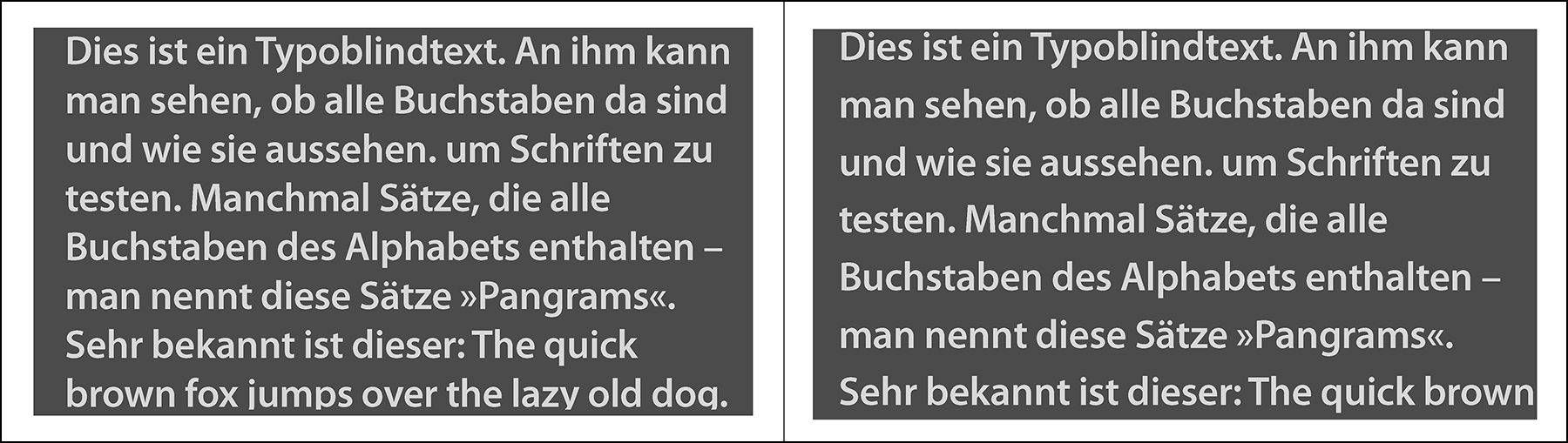 Helle Schrift auf dunklem Grund, Laufweite automatisch und korrigiert