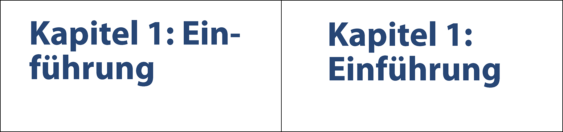 Titel sollten grundsätzlich nicht getrennt werden. Beispiel links: Silbentrennung, Beispiel rechts: Absatztrennung