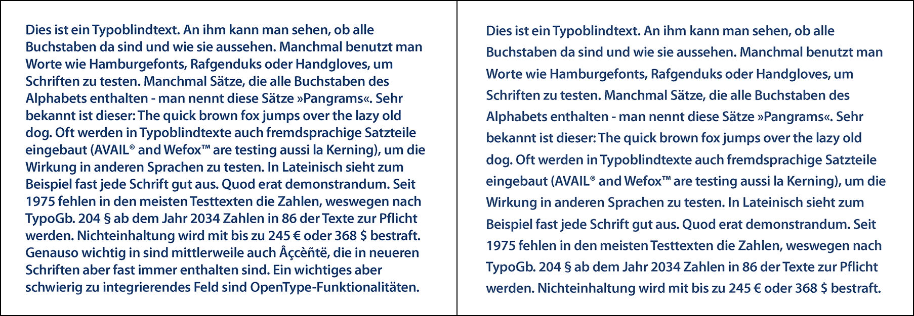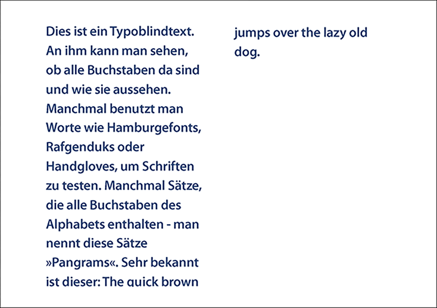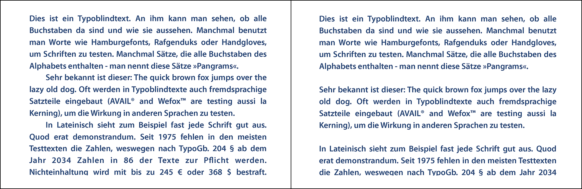 Der linksbündige Satz und der Blocksatz sind die am häufigsten verwendeten Textausrichtungen, wobei der Blocksatz ruhiger wirkt und sehr gut für große Textmengen eingesetzt werden kann. Blocksatz können Sie aber nur bei ausreichend großen Zeilenlängen nutzen: ab ca. 35 Zeichen. Die linksbündige Ausrichtung wirkt eher dynamisch und ist besser für kleinere und mittlere Textmengen sowie für kurze Zeilen geeignet.