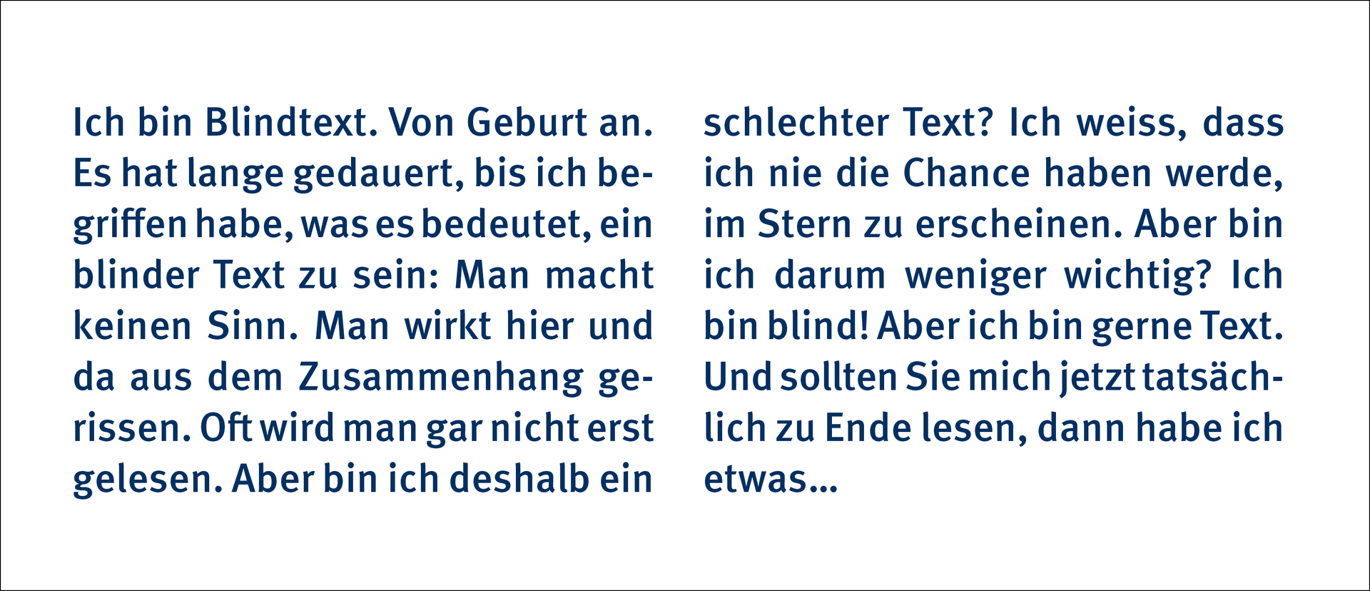 Es gibt eine ideale Zeilenlänge beim Lesetext, die möglichst nicht unter- oder überschritten werden sollte. Ansonsten wird der Text sehr schwer lesbar, was dann mit erhöhtem Zeitaufwand und kognitiver Leistung verbunden ist. Zu lange Zeilen wirken ermüdend und die Leser:innen haben Schwierigkeiten, am Zeilenende in die richtige neue Zeile zu springen. Zu kurze Zeilen sind anstrengend, weil die Leser:innen oft in eine neue Zeile springen müssen und Gesamtzusammenhänge weniger leicht erfassen können.