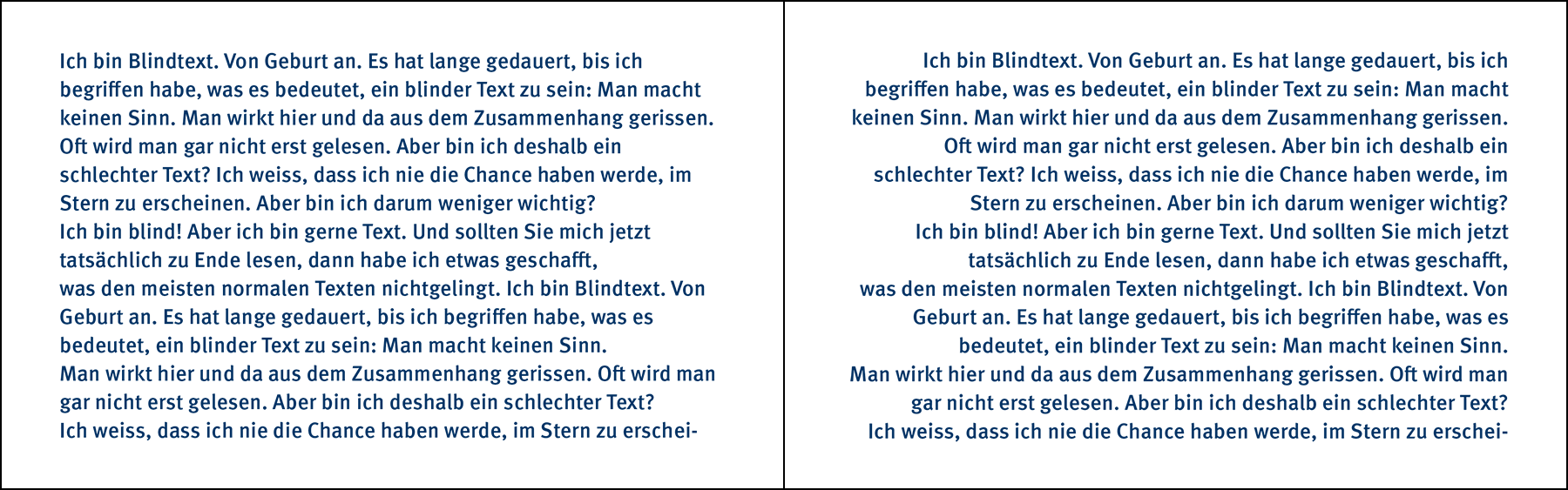 Links: Blocksatz (nicht zu verwenden bei kurzen Zeilen) Rechts: linksbündiger Satz (Flattersatz)