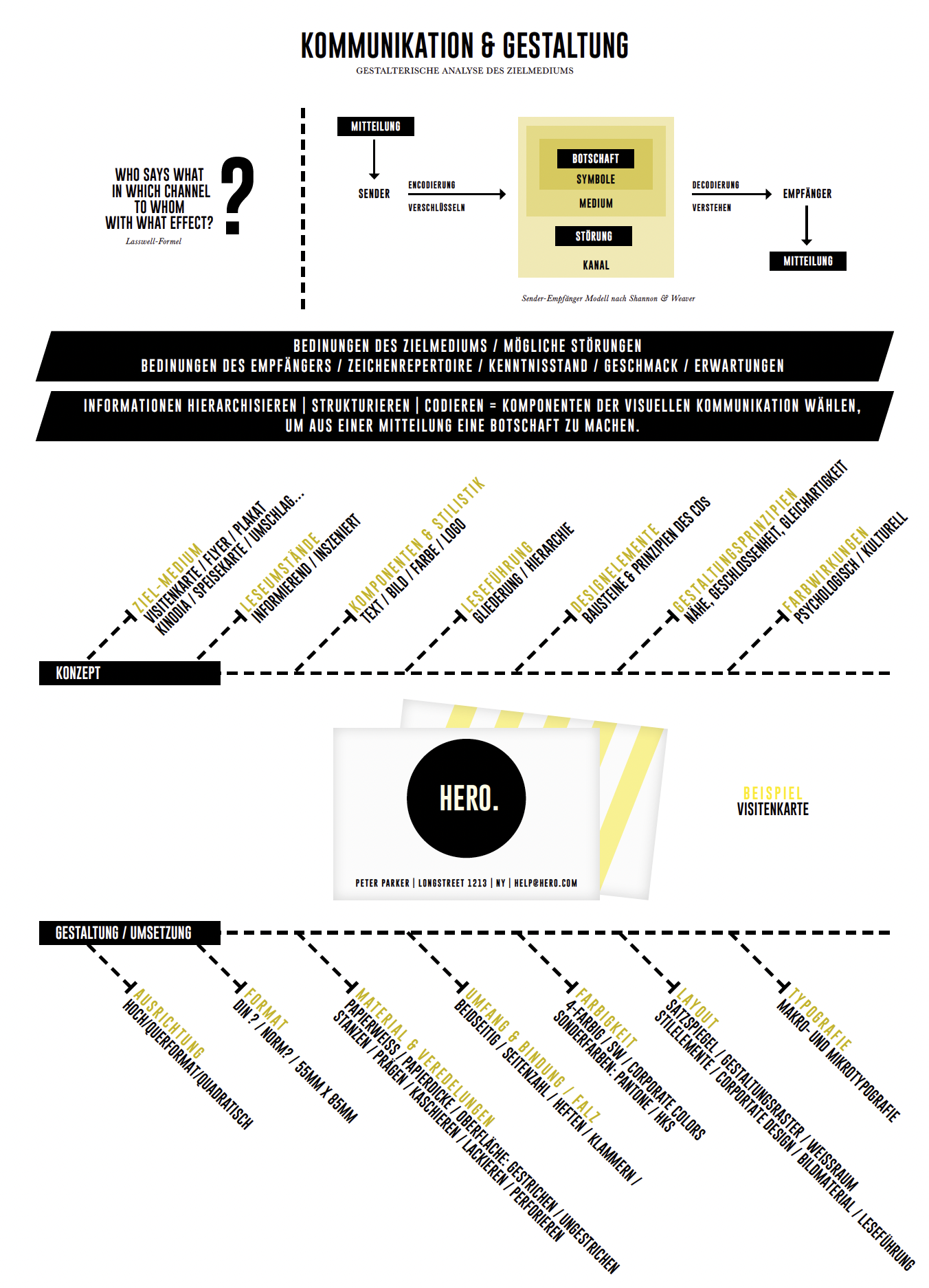 Aus der Fülle von Informationen eines Briefings gilt es schliesslich die Kernaussage herauszuspüren. Mario Pricken spricht hier von der sogenannten «Single-Minded-Proposition», also der Zielformulierung. Wie kann das Anliegen des Kunden mit einem einzigen Satz formuliert werden? Was ist das Anliegen des Kunden genau? Was will er seinen Kunden mitteilen? Ganz wichtig dabei ist, dass man sich bewusst wird, für wen man gestaltet. Wer ist das Zielpublikum? In den meisten Fällen bin das weder ich als Gestalter noch mein Kunde als Auftraggeber, sondern der Kunde des Kunden. Denn dieser soll ja schlussendlich angesprochen werden.