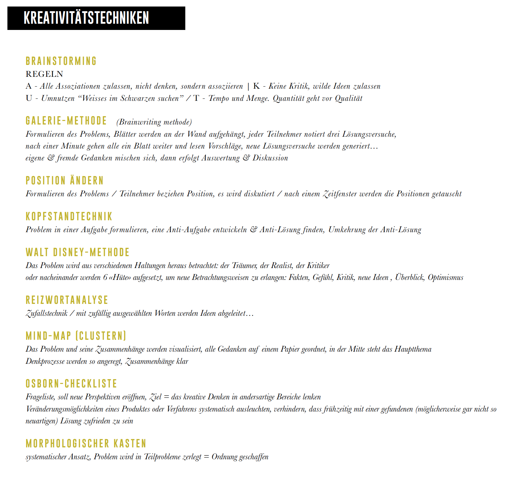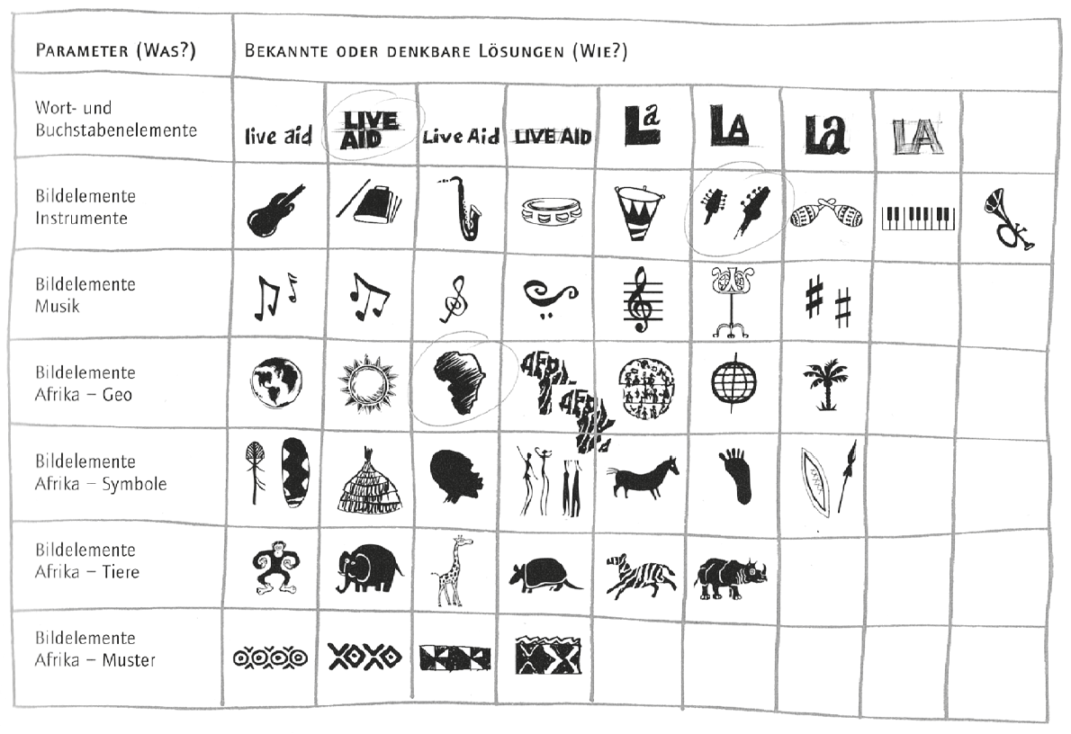 Hier gibt es ganz unterschiedliche Methoden. Eine Möglichkeit ist das Arbeiten mit der «Morphologischen Matrix» (siehe nächste Seite). Welche Methode man auch wählt, entscheidend ist dabei erst einmal in die Breite zu gehen. Verschiedenste Bereiche des Themas mit ein zu beziehen, und die Ideen in dieser Phase keinesfalls zu bewerten!