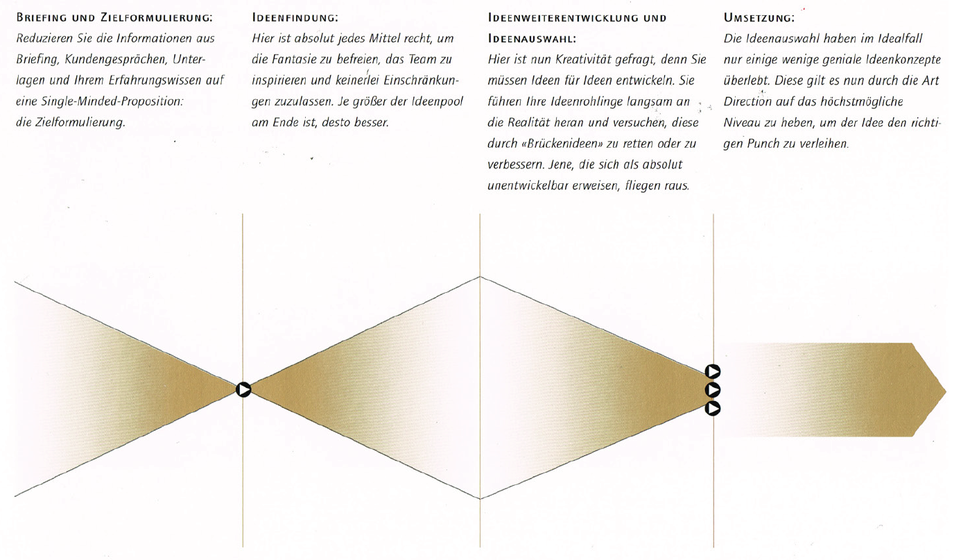 Mario Pricken visualisiert in seinem Buch «Kribbeln im Kopf – Kreativitätstechniken & Denkstrategien für Werbung, Marketing und Medien» einen möglichen Kreativitätsprozess mit dem folgenden Schema: