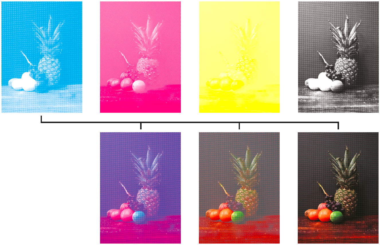 Pro Durchlauf wird im Offsetdruck nur jeweils eine Farbe gedruckt. Geht man vom meist verwendeten Farbraum CMYK aus, kann man mit Maschinen mit vier Farbwerken bereits sehr viele Farben abdecken. Auch wenn nur Cyan, Magenta, Yellow und Schwarz zur Verfügung stehen, kann durch feine Rasterung fast jedes Mischverhältnis erzeugt werden. Das beruht auf einer optischen Unschärfe des menschlichen Auges, das nur aus großer Nähe die einzelnen Farbpunkte aus den vier Farben unterscheiden kann. Diese werden als kleine Punkte geschickt neben- bezw. übereinander gedruckt, so dass im menschlichen Auge der Eindruck eines Halbtons (Mischfarbe) entsteht.