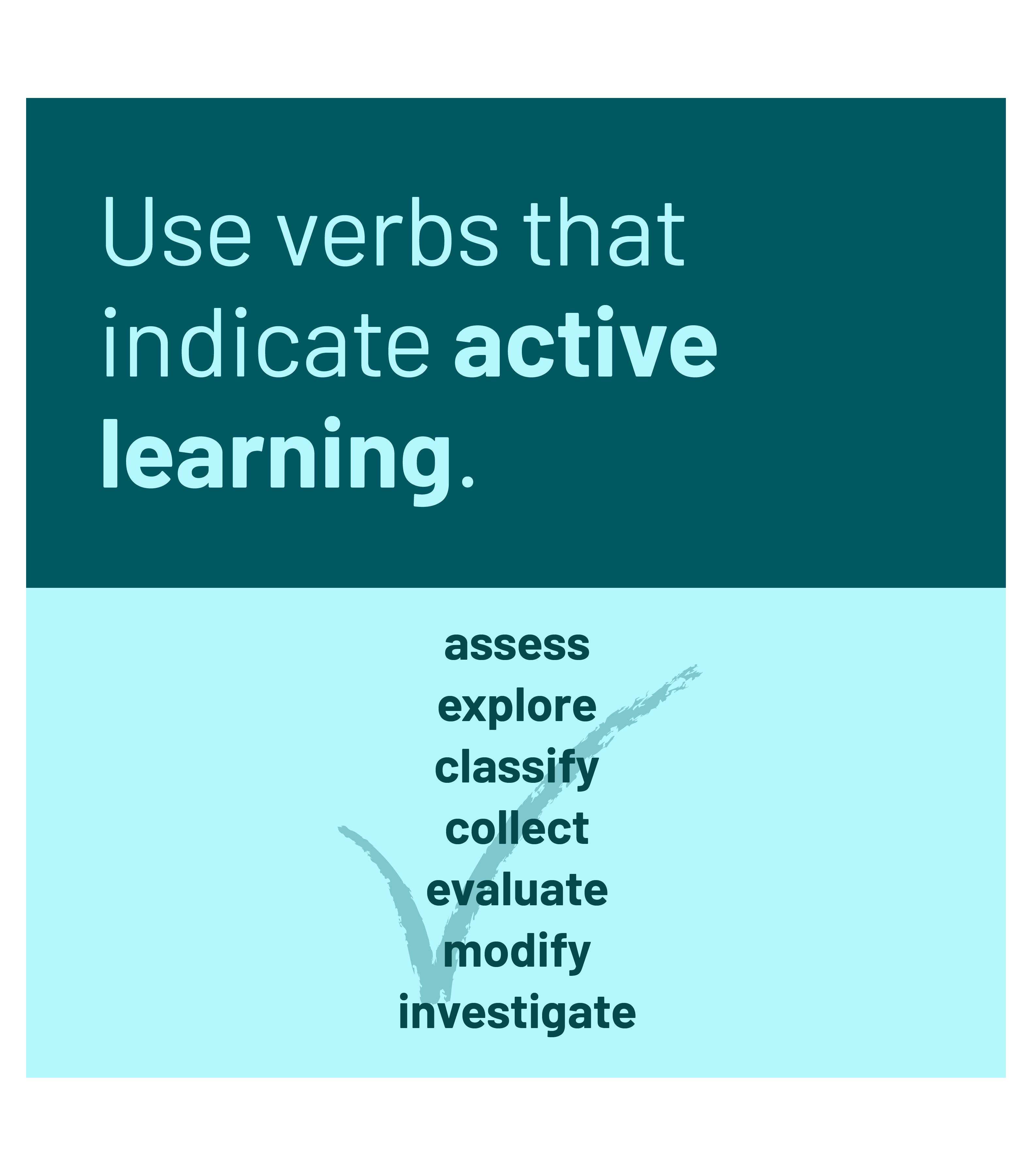 Verwenden Sie konkretere Wörter wie «bewerten», «erkunden», «klassifizieren», «sammeln», «evaluieren» usw. Dies sind Verben, die auf aktives Lernen hinweisen.