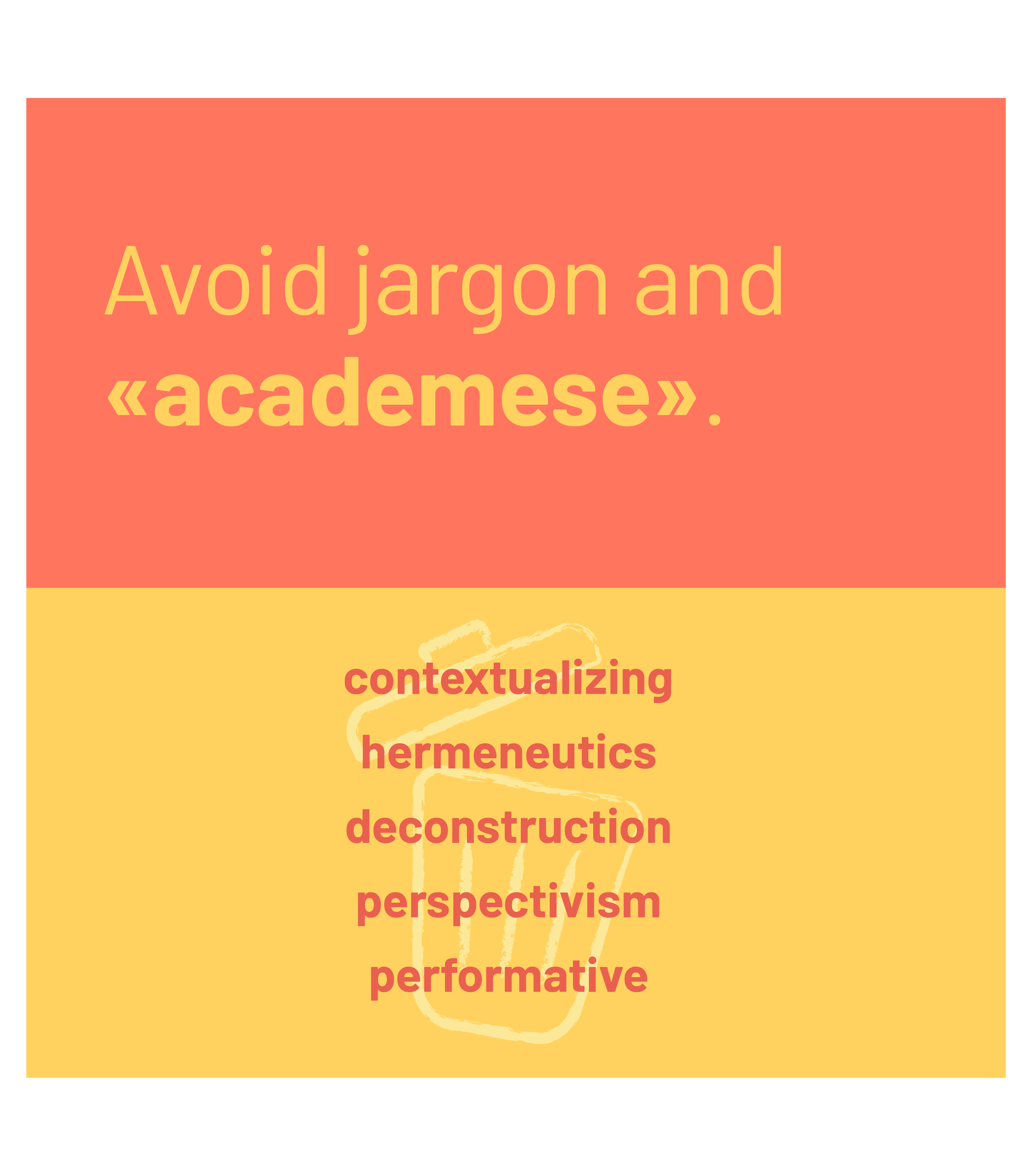 Manchmal ist es natürlich notwendig, technische oder akademische Begriffe zu verwenden. In diesem Fall ist es umso wichtiger, diese Fachbegriffe mit alltäglichen Wörtern zu umgeben.