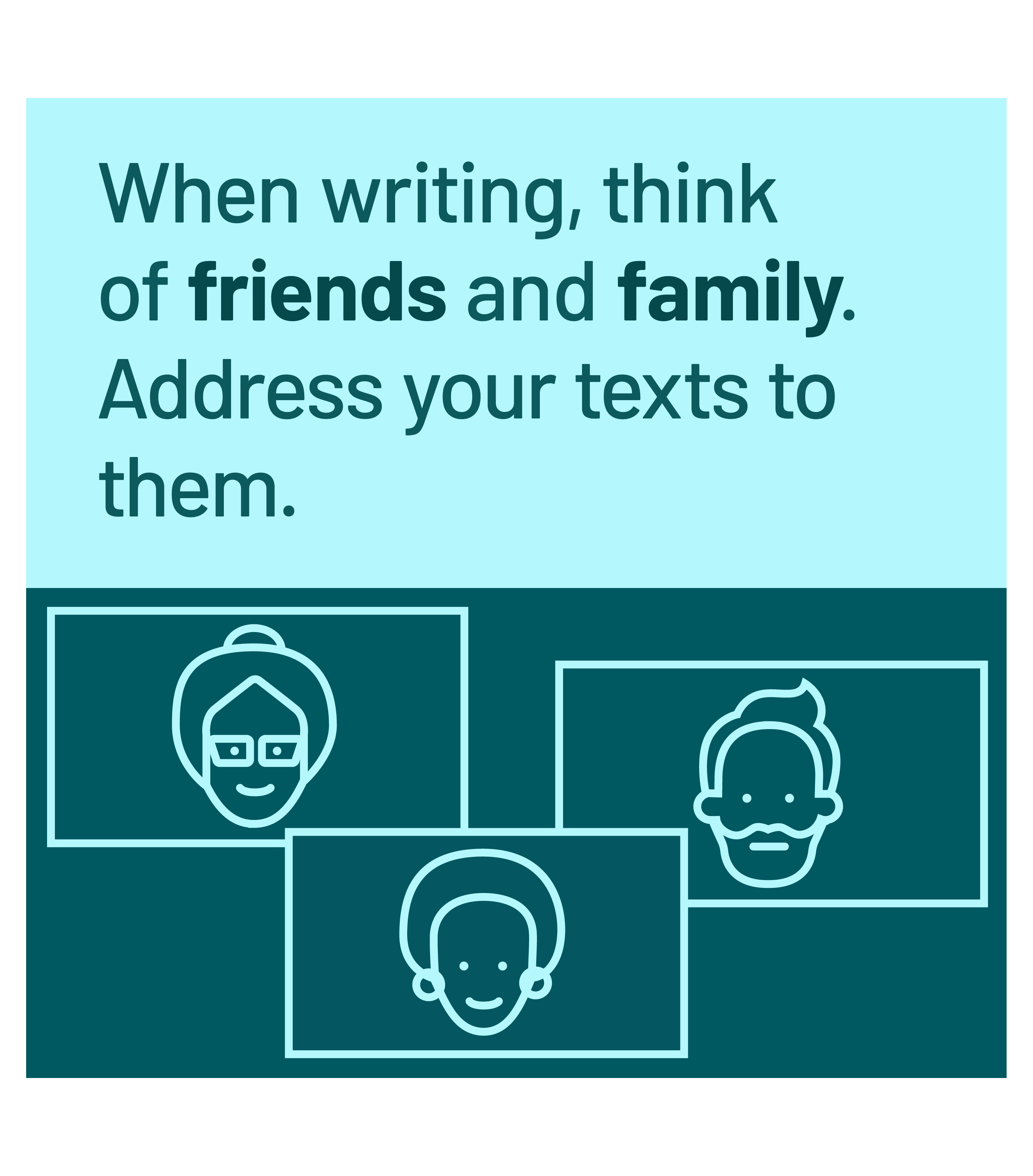 Denken Sie beim Schreiben an Freunde und Familie. (Nicht an Peers.) Richten Sie Ihre Texte an sie.