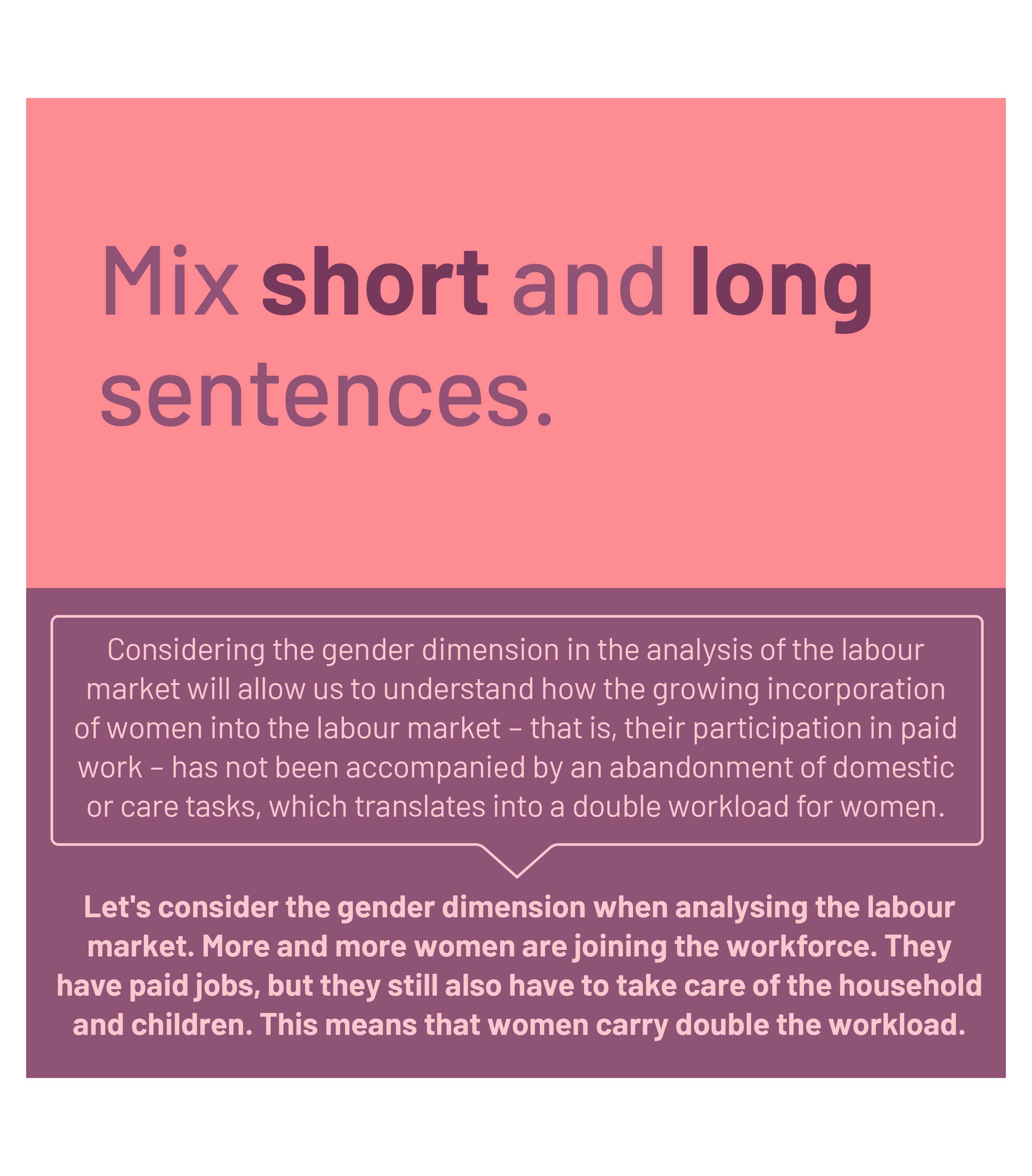 Wenn Sie einen langen Text mit überwiegend langen Sätzen schreiben müssen, gliedern Sie den Text optisch auf, indem Sie kürzere Absätze bilden und hier und da Zwischenüberschriften einfügen und die Absätze nach Themen gruppieren.