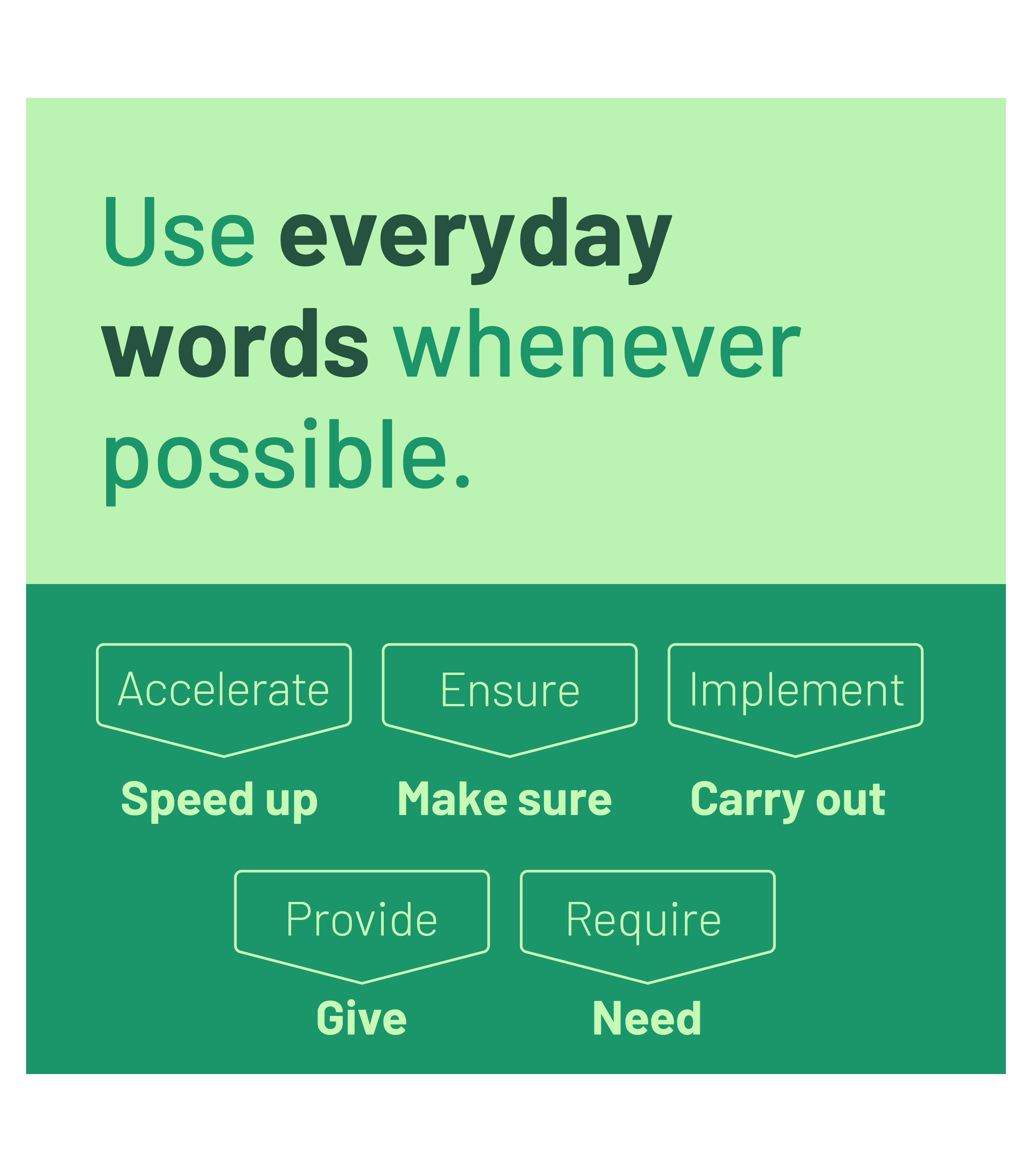 Verwenden Sie in Ihren Sätzen alltägliche Wörter, damit Ihre Texte klar und verständlich sind, insbesondere für Personen, die mit dem Thema nicht vertraut sind.