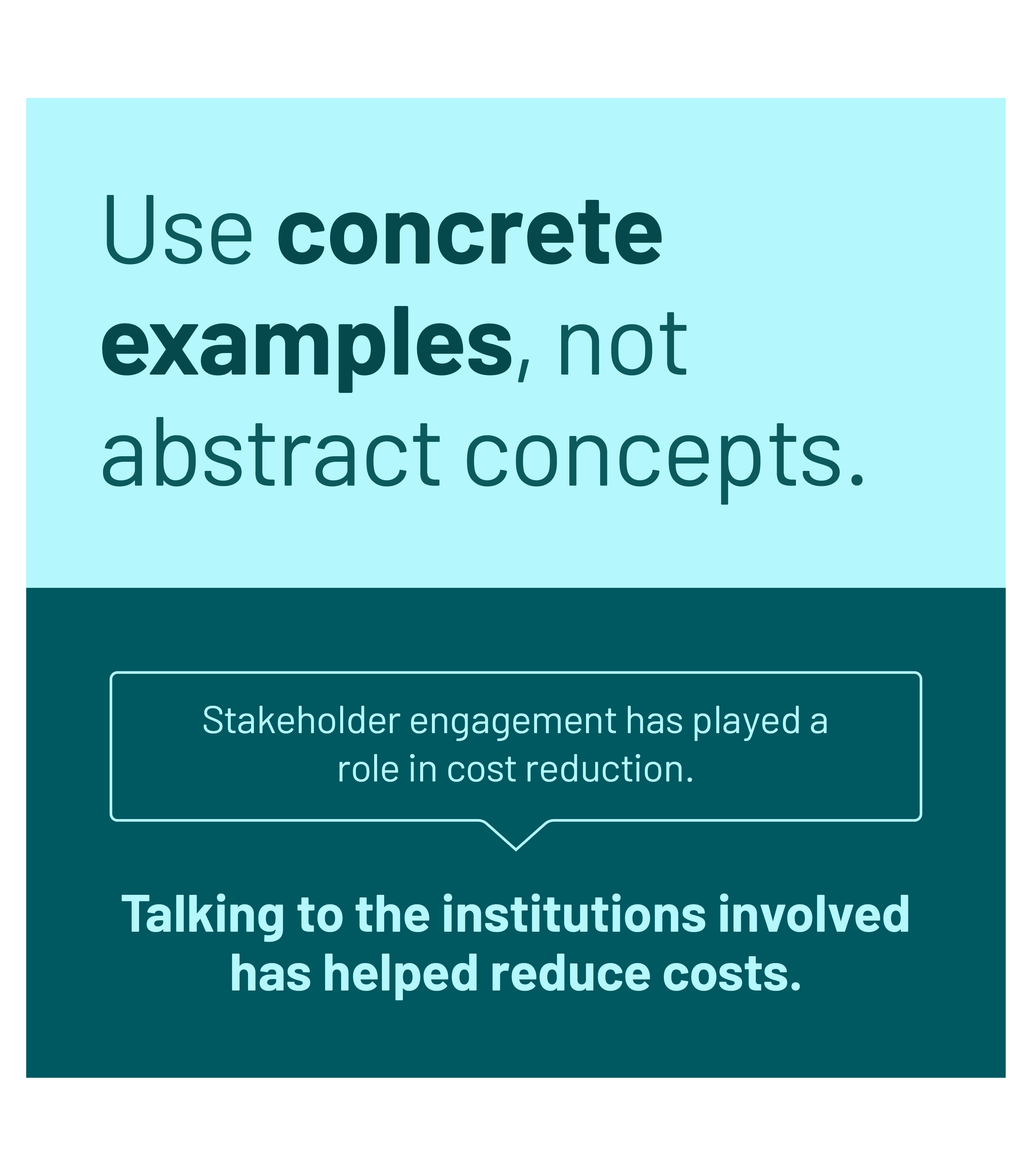 Unserem Gehirn fällt es leichter, konkrete Beispiele zu verarbeiten als abstrakte Konzepte. Wenn möglich, illustrieren Sie ein Konzept mit einem praktischen Beispiel, damit die Lernenden verstehen, wie das Konzept in der realen Welt angewendet wird.
