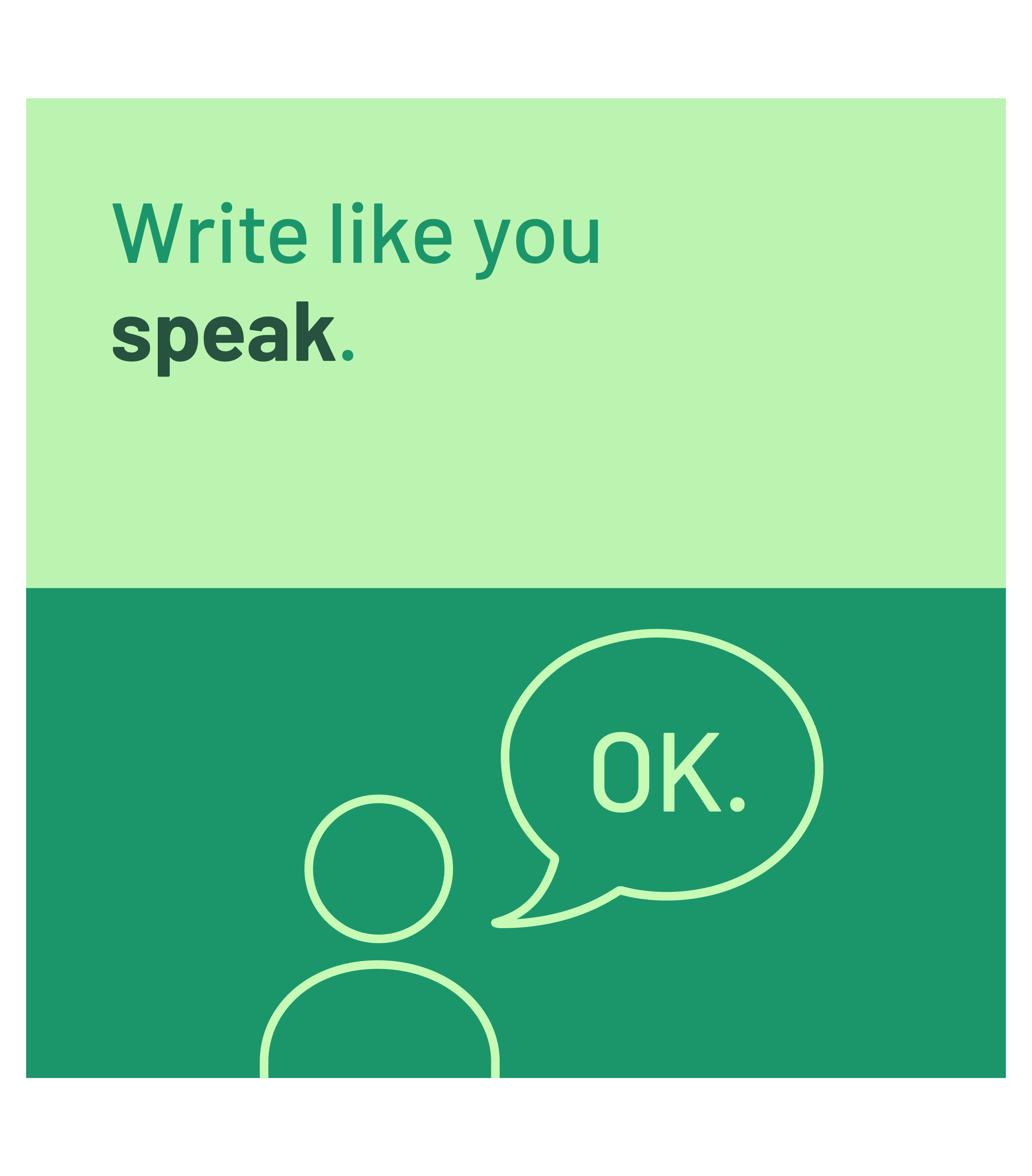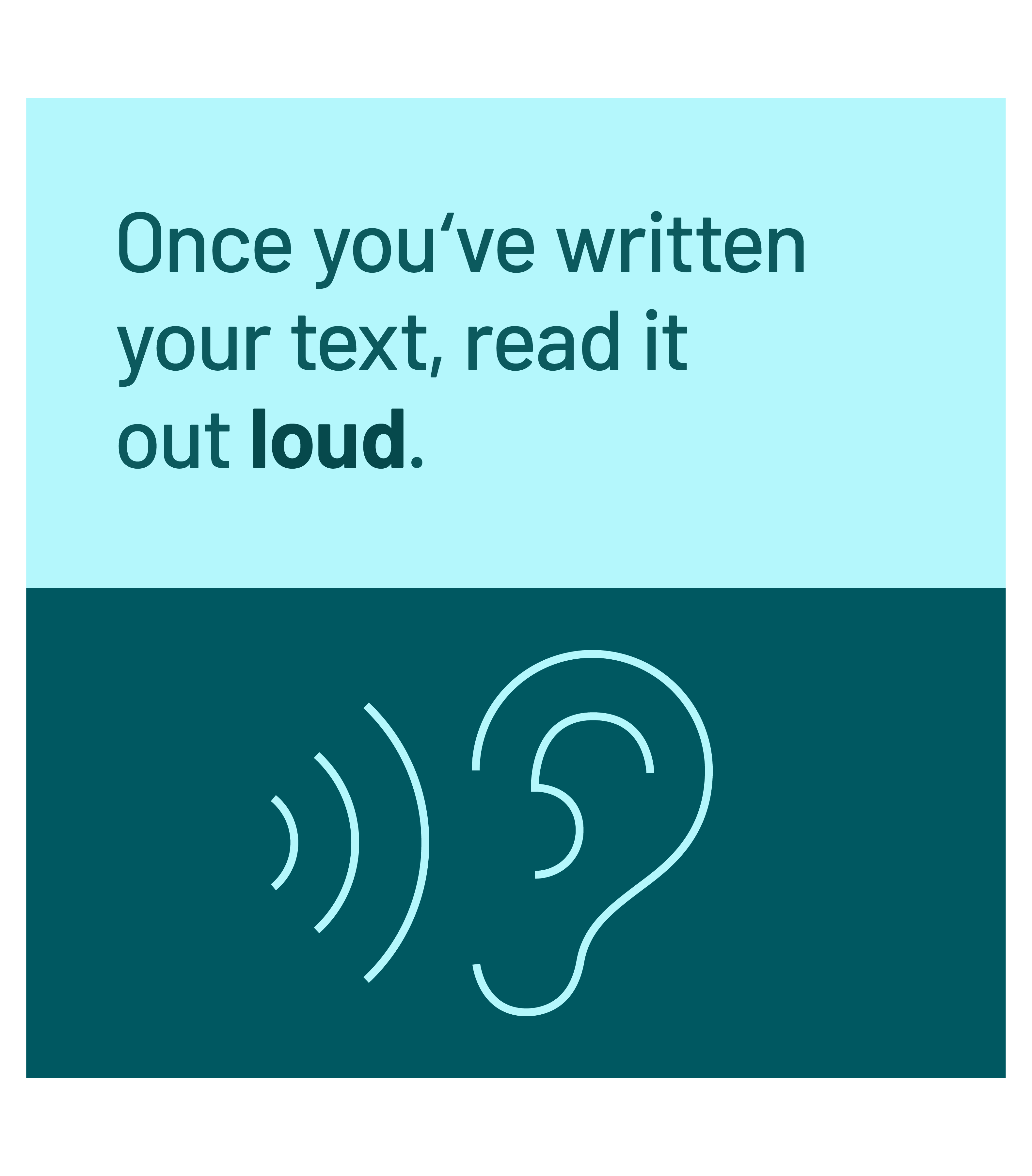 Wir schreiben «für das Sprechen» und nicht «für das Lesen». In vielen Fällen werden wir unseren geschriebenen Text laut vorlesen (z. B. vor einer Kamera). Dadurch ändert sich die Art und Weise, wie wir schreiben: Wir müssen darüber nachdenken, wie wir etwas sagen würden, und nicht, wie wir es schreiben würden. Das bedeutet oft, dass wir etwas informellere Sätze schreiben (statt formeller und akademischer), alltägliche Wörter verwenden und abstrakte Konzepte durch praktische Beispiele veranschaulichen.