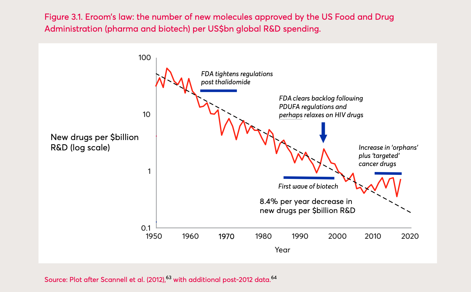 Eroom’s Law: the number of new molecules approved by the US Food and Drug Administration (pharma and biotech) per billion US dollars global R&D spending. Jones R, Wilsdon J. The Biomedical Bubble: Why UK research and innovation needs a greater diversity of priorities, politics, places and people. Report [Internet]. Nesta, London. 2018. Reprinted with permission from James Wilsdon.