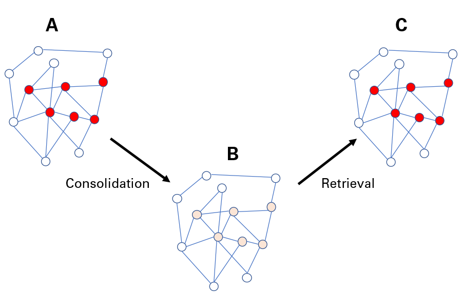 Neural model of memory. During a learning experience, a specific neural circuitry (also called engram) becomes activated and encodes the information (A). The red dots illustrate activated neurons. After memory consolidation, this information is stored in long-term memory in a low-activity state (B). When learned information is retrieved, the same neural circuitry becomes activated (C). Adapted from Josselyn et al., Nat Rev Neurosci. 2015 Sep;16(9):521-34.
