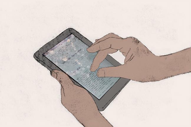 Hand zooming in on a tablet screen (© New Media Center, University of Basel)