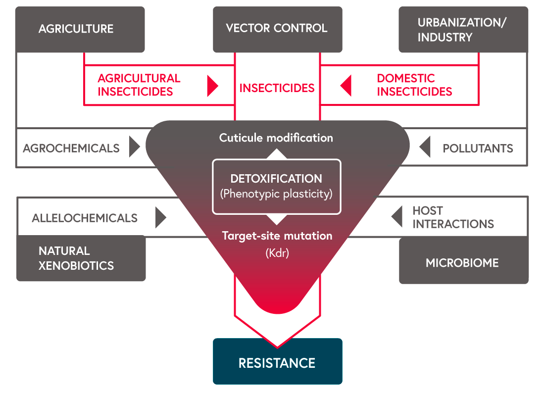 Insecticide-based selection pressures are shown as red arrows. Other factors potentially affecting resistance mechanisms are agrochemicals from agriculture, pollutants from urbanisation or industry, allelochemicals from natural xenobiotics, or host interactions from microbiomes. (Nkya TE et al, 2013. CC BY-NC-ND 3.0; redrawn from original figure)
