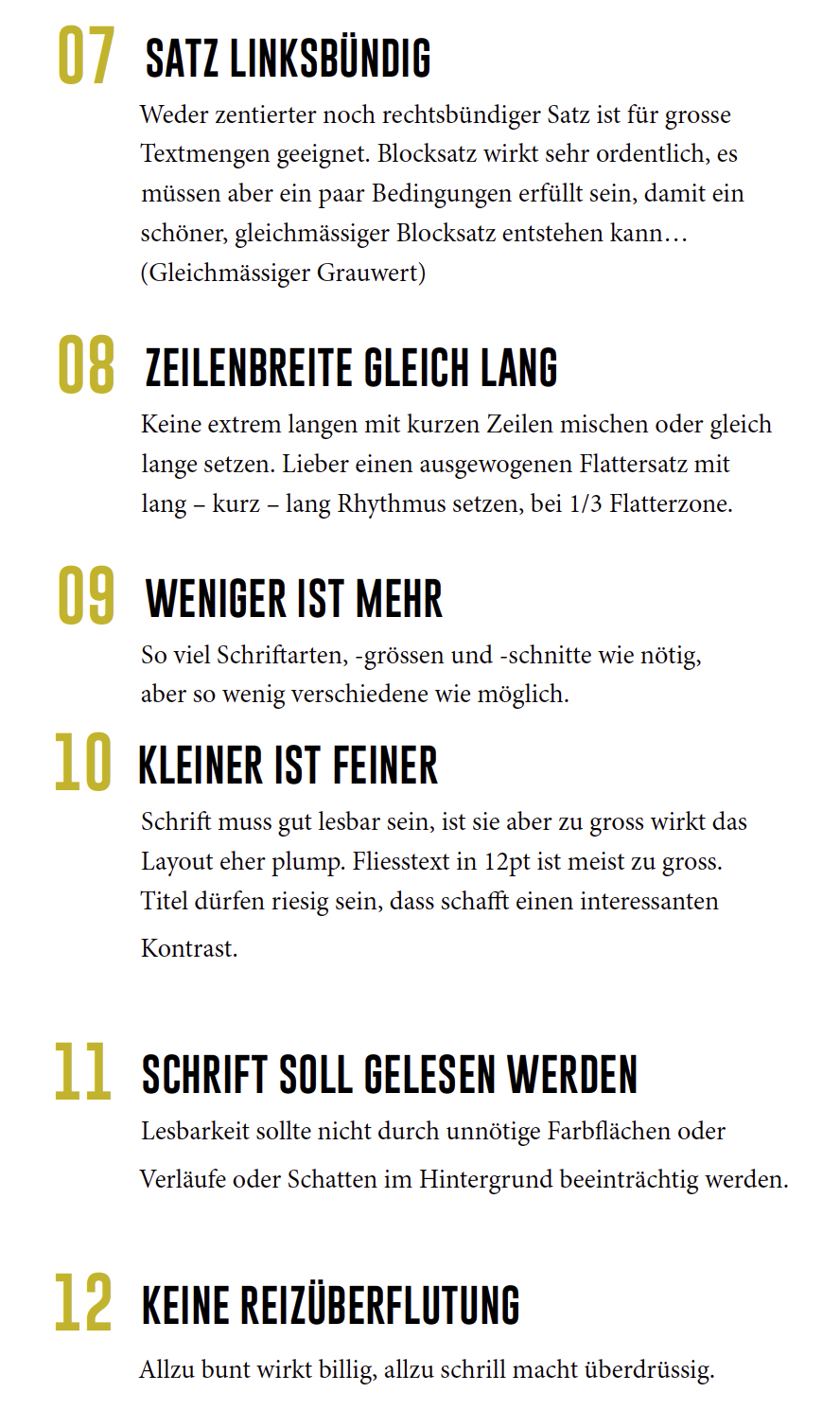Ist neben einem passenden Schriftgrad die wichtigste Komponente für gute Lesbarkeit. Die Faustregel sagt: 40-80 Zeichen inklusive Zahlen, Satzzeichen und Leerräume.