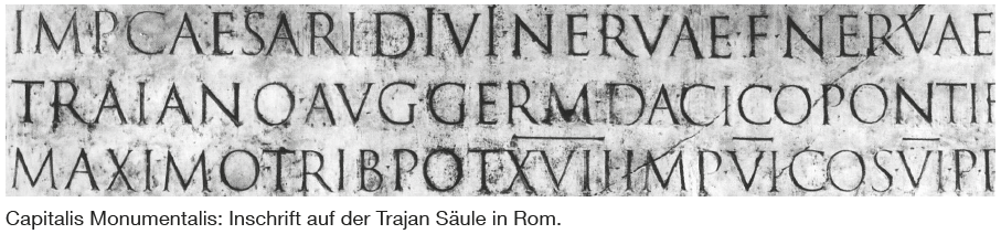 Die Capitalis Monumentalis kann als die Mutter unserer heutigen Schriften bezeichnet werden. Zwar kam sie während des Mittelalters ausser Mode, ihre Schönheit und Ausgewogenheit wurde aber von den italienischen Druckern und Schriftgiessern der Renaissance wiederentdeckt. Erweitert durch die Kleinbuchstaben der Minuskel entwickelten sie daraus die ersten Antiqua Schriften.