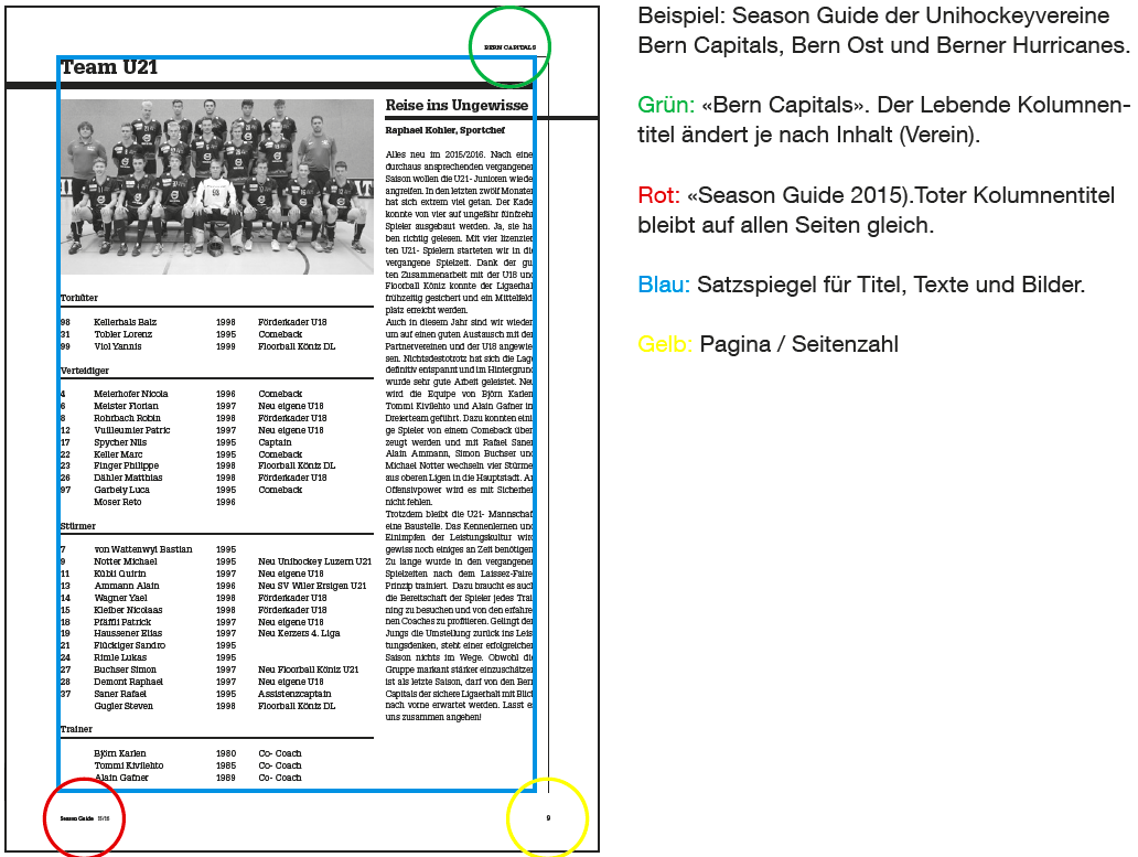 Typografische Gestaltungsraster sollen dem Grafikdesigner helfen Layouts klar und übersichtlich zu strukturieren und gewährleisten zudem eine einheitliche Erscheinung über mehrere Seiten eines Produkts hinweg. Sie dürfen aber nicht zum Gefängnis werden. Es ist deshalb durchaus üblich das erstellte Raster mit gewissen Elementen zu brechen. Beispielsweise verlassen die Bilder im obenstehenden Schema die Grenzen des Gestaltungsrasters. Es gilt aber stets das Motto:
