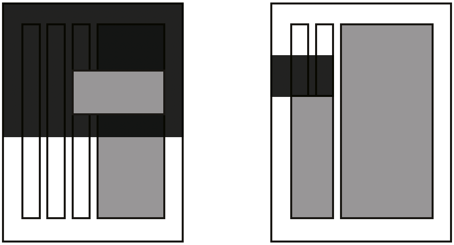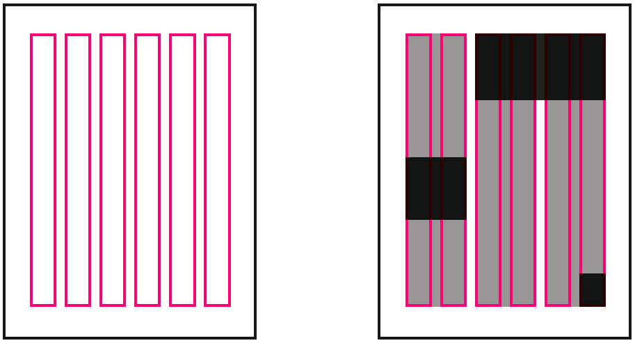 Wir stellen also fest, dass es zwei Arten von Spalten gibt: Die Rasterspalten (Rot) und die Textspalten (Grau). Die beiden können sich genau entsprechen, müssen aber nicht. Es ist nicht unüblich ab einer gewissen Seitengrösse mit 4, 5 oder 6 Rasterpalten zu arbeiten, auch wenn diese für den Leser selten als solche ersichtlich sind. Ein solches Layout bietet aber die grösseren gestalterischen Variationen. Nicht zuletzt da auch die Bilder (schwarz) daran ausgerichtet werden können: