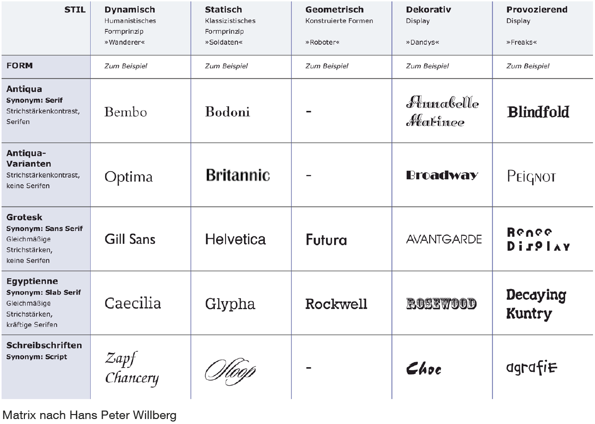 Wer mit gut gestalteten Schriften arbeitet, braucht oft nicht mehr als eine Schriftfamilie. Nach dem Grundprinzip von Ähnlichkeit und Kontrast und mit dem nötigen Fingerspitzengefühl können aber auch Schriften aus unterschiedlichen Familien miteinander zu kombiniert werden. Hierbei hilft die Schriftgruppen-Matrix: