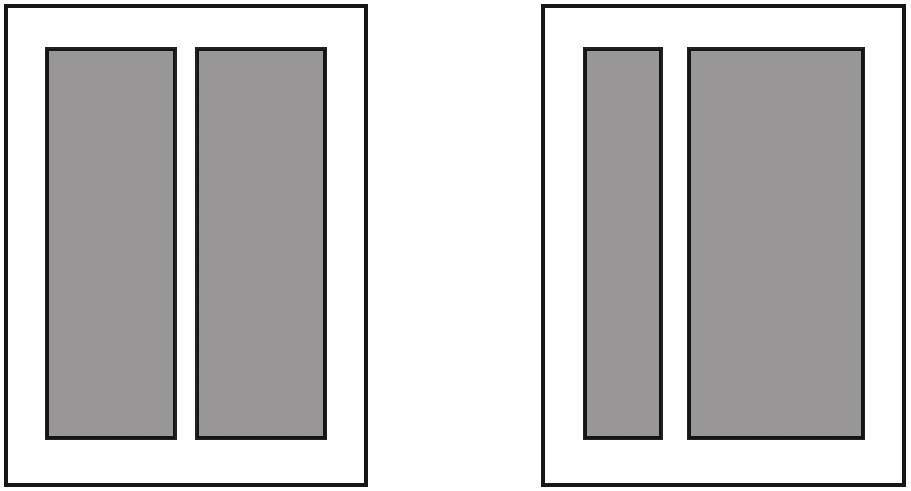 Grundsätzlich ist es natürlich möglich das Verhältnis der beiden Spalten frei zu wählen. In der Regel jedoch ist es üblich auch hier mit abgestimmten Proportionen zu arbeiten. Für die breitere Spalte werden deshalb mehrere schmale Spalten zusammengefasst. Der Spaltenabstand soll so weit gewählt werden, dass der Leser auf keinen Fall in die nächste Spalte springt, sondern direkt nach unten in die nächste Zeile. Er sollte somit mindestens dem Zeilenabstand entsprechen. Müssen aus Platzgründen die Spalten eng aneinader geschoben werden, können sie durch eine feine Linie getrennt werden.