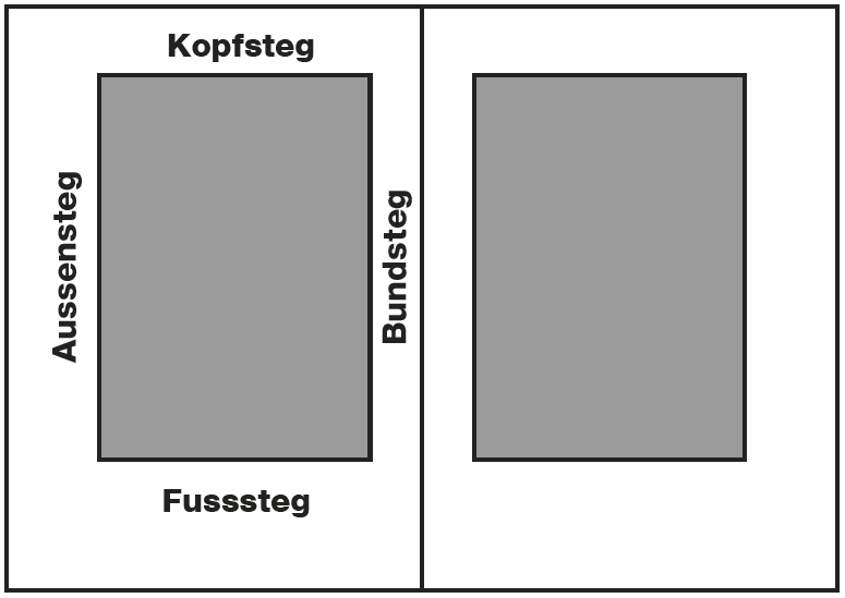 Da meist die gesamte Doppelseite betrachtet wird, sollte die Gestaltung auch entsprechend auf die Doppelseite ausgerichtet werden. Das heisst, dass zB. bei einer Broschüre der Bundsteg schmaler ist, als die Aussenstege. Achtung: Bei einer gebundenen Heftung gilt meist genau das Gegenteil. Hier sollten die Bundstege genügend breit sein, da durch die Bindung (Wölbung) der sichtbare Raum verkürzt wird.